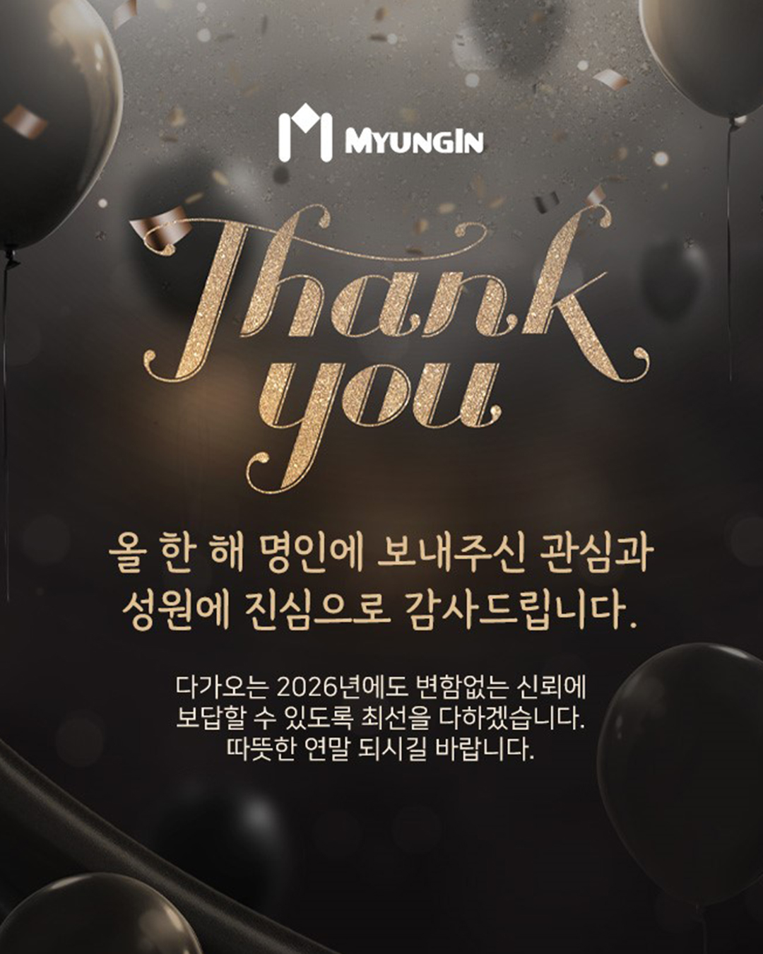 올 한 해도 수고 많으셨습니다. 2025년 명인에 보내주신 관심과 성원 그리고 함께해 주심에 깊이 감사드립니다. ⠀ 다가오는 2026년도 변함없는 신뢰에 보답할 수 있도록 최선을 다하겠습니다 따뜻한 연말 되시길 바랍니다^_^